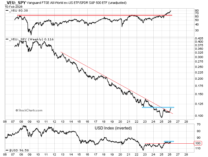 - The U.S. dollar is also testing its range lows, and a loss of support likely accelerates the move in international stocks, as $VEU closed at record highs today.