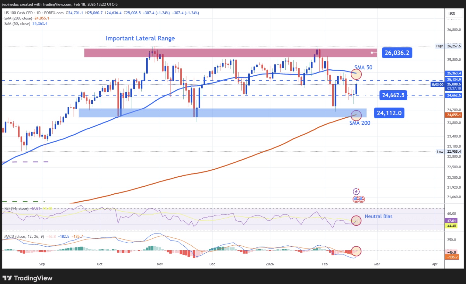 The Nasdaq remains locked in a broad range, with resistance near 26,000 and support around 24,000.