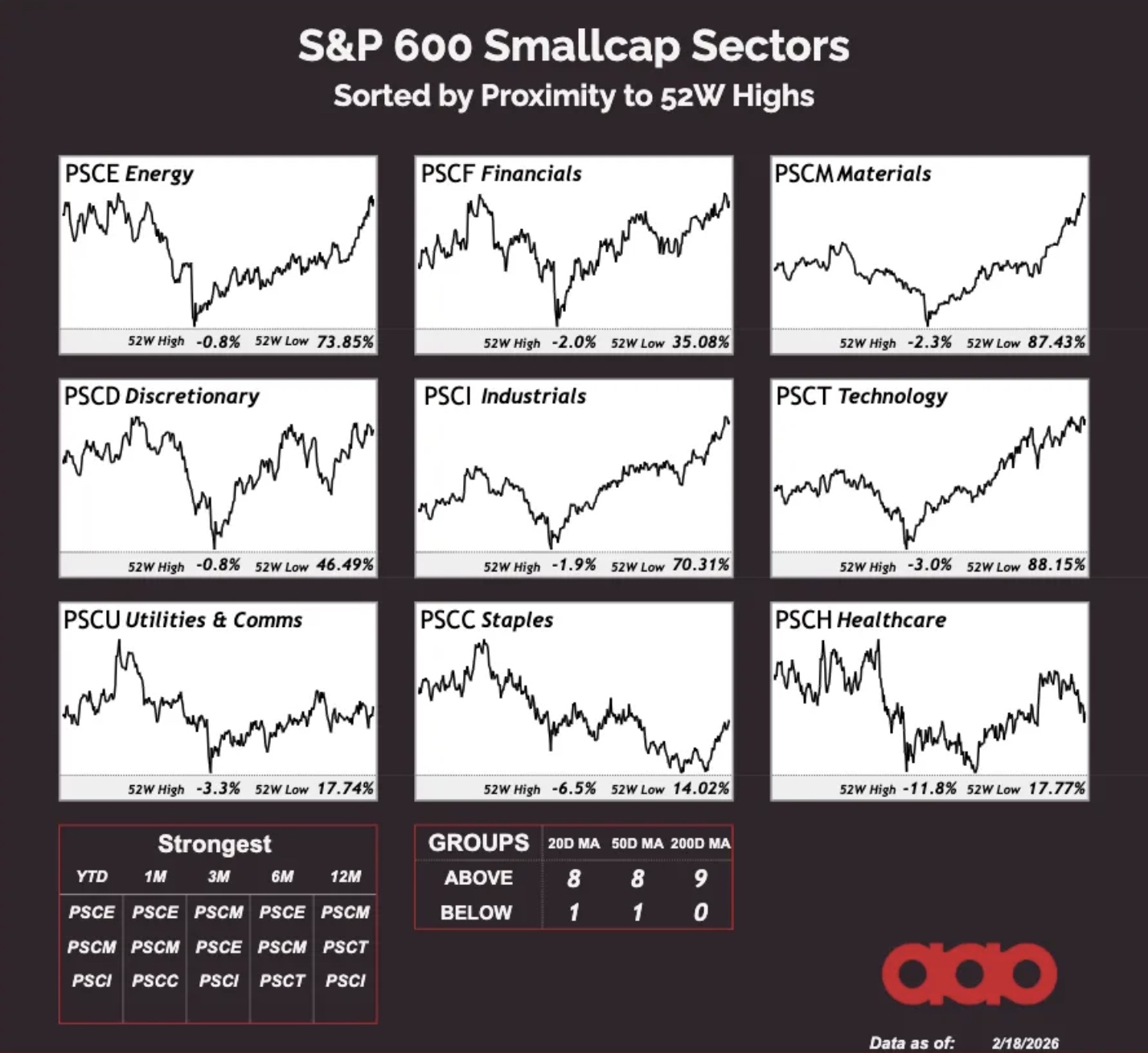 All nine small-cap sectors are trading above their 200-day moving averages, with eight also holding above their 20-day.