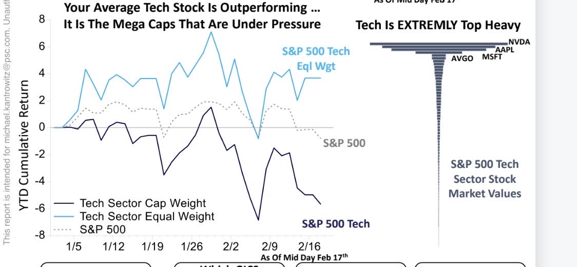 Technologyโs recent underperformance is largely a cap-weight issue, as the average tech stock is still beating the S&P 500.