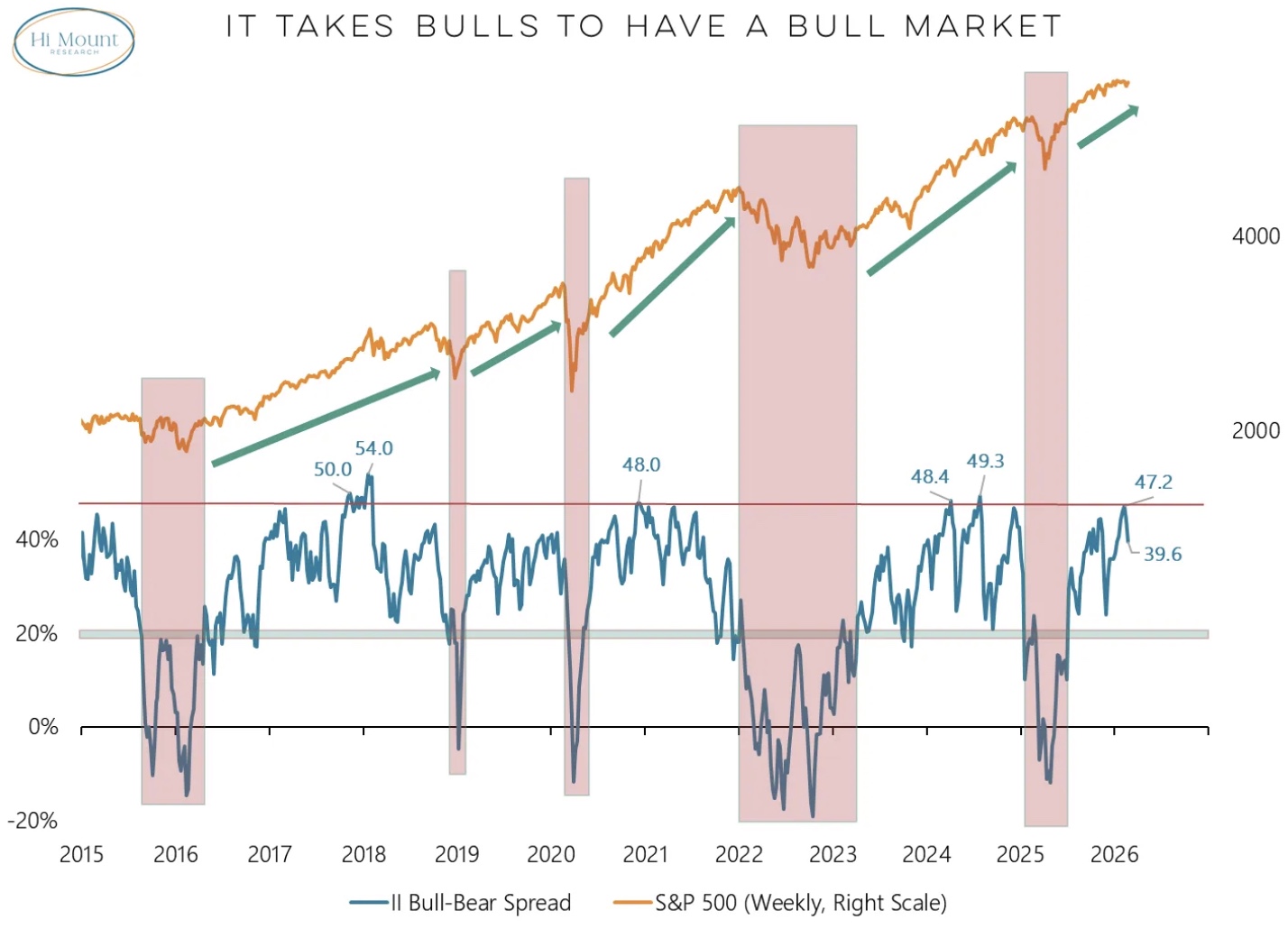 Historically, when the bullβbear spread drops below 20%, forward returns have tended to deteriorate.