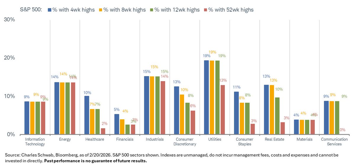 Utilities, Industrials, and Energy currently boast the highest percentage of components registering new highs.
