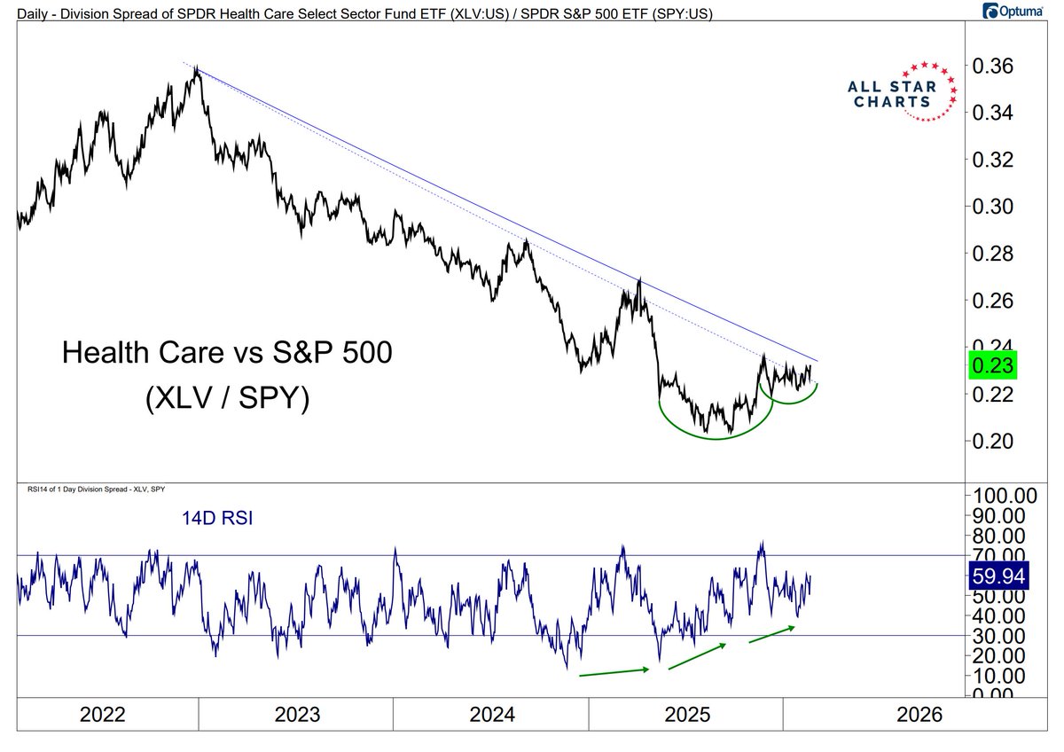 Health Care is gaining relative strength versus the S&P 500 with momentum continuing to improve.
