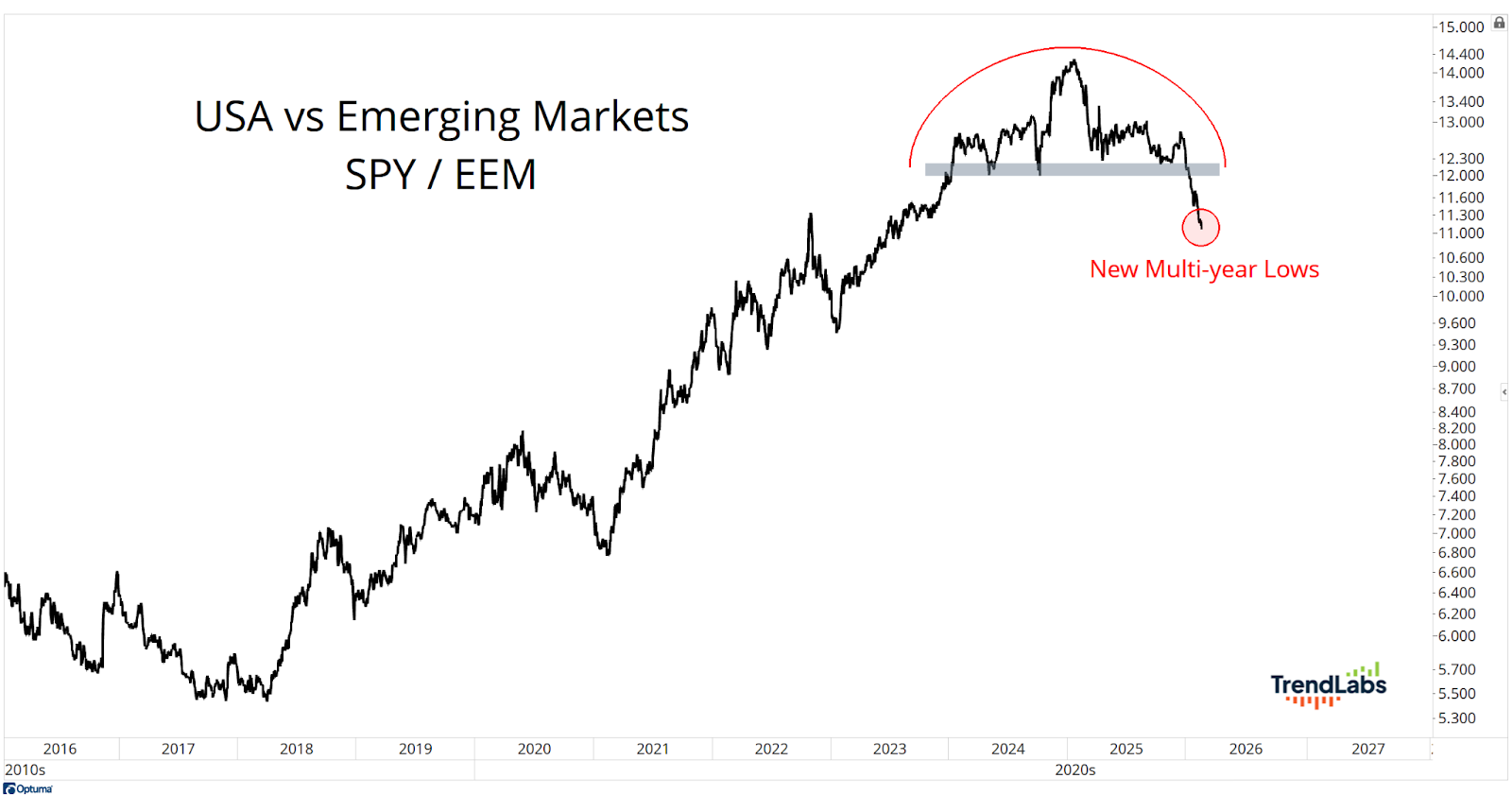 The S&P 500 is pressing to fresh multi-year lows relative to emerging markets.