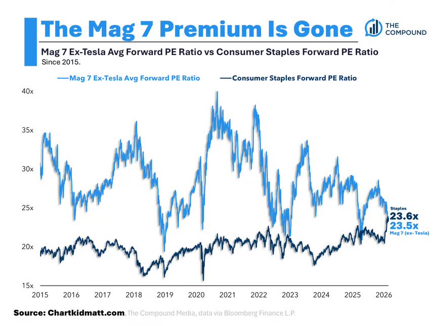 The Mag Seven is currently trading at a discount relative to the market’s most defensive groups.