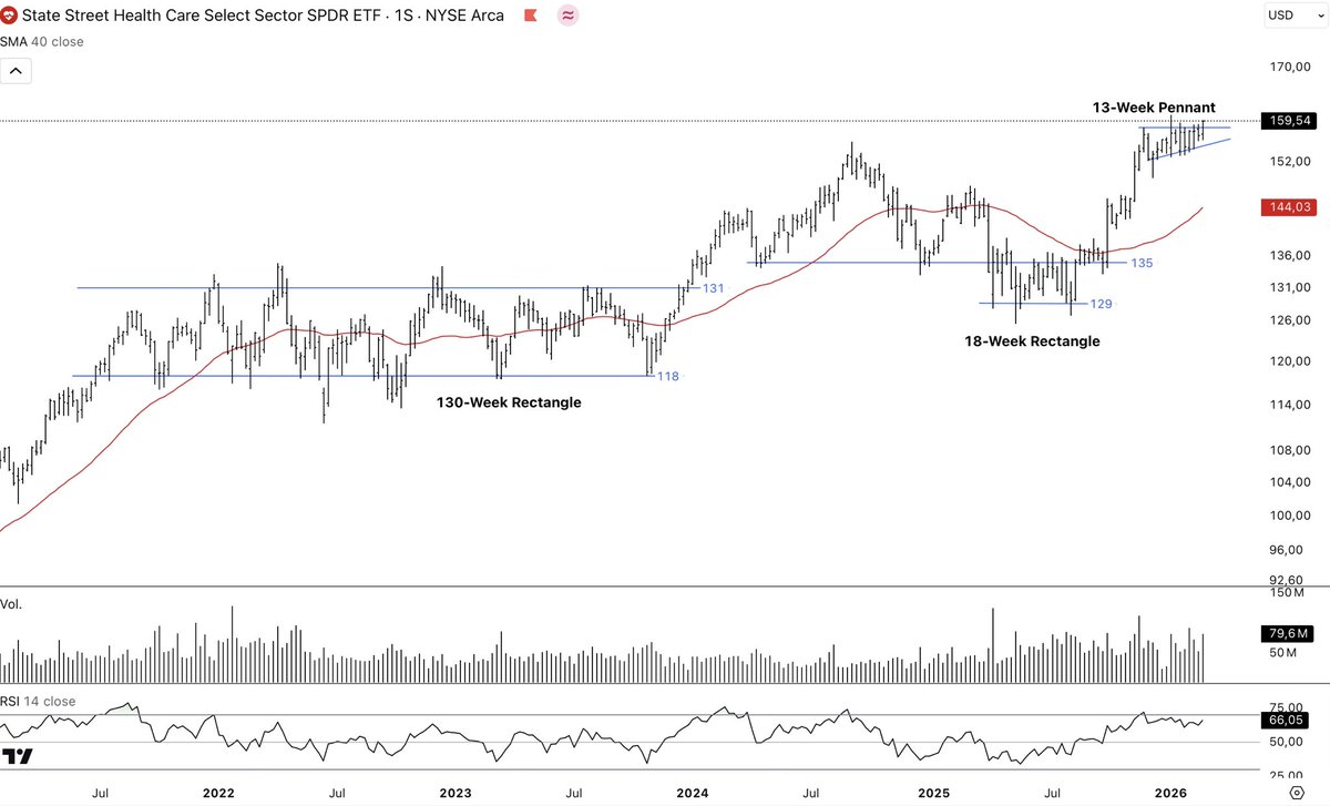 Large-Cap Health Care ($XLV) just posted new all-time highs, following a lengthy consolidation after last summerโs sharp rally.