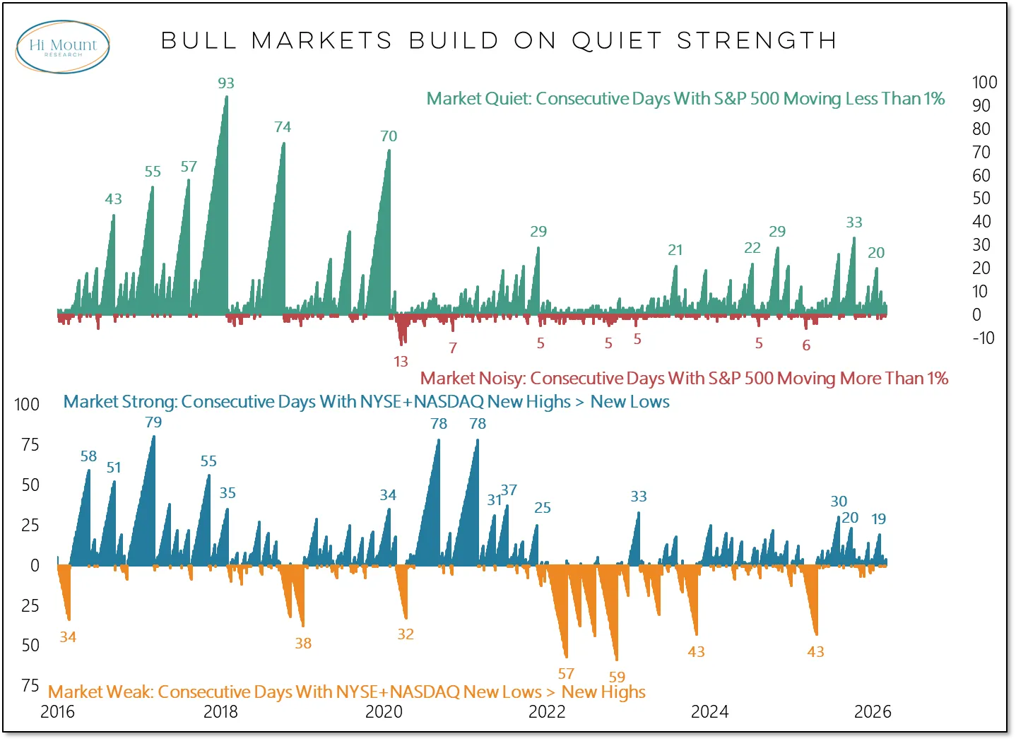 Prolonged periods of sub -1% moves in the S&P 500 tend to align with sustained new highs versus new lows across the NYSE and Nasdaq.