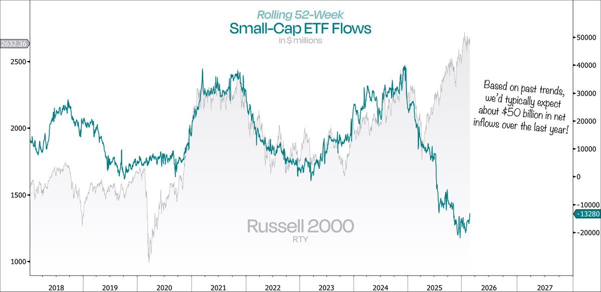 Looking at rolling one year inflows in Small-cap ETFs, there's a notable disconnect between performance and capital allocation.