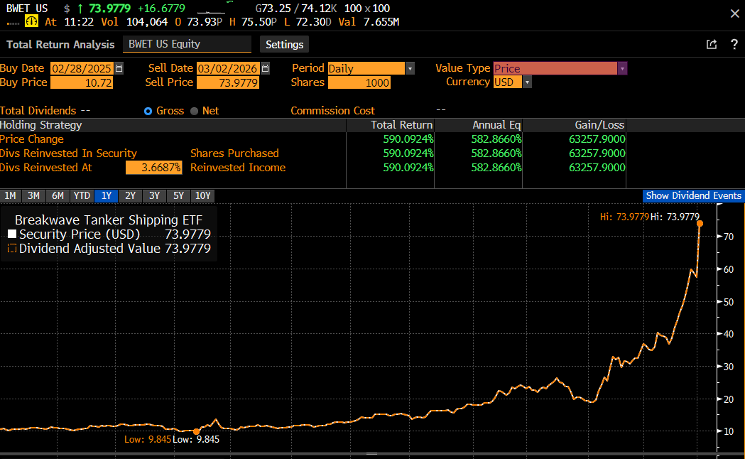 The Breakwave Tanker Shipping ETF ($BWET) closed at new all-time highs while posting its best single-day gain on record.