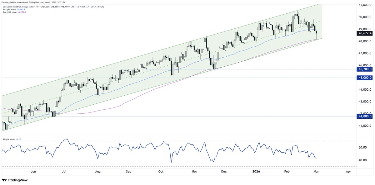 The Dow Jones Industrial Average found support at its rising 100-day moving average and the lower bound of its ascending channel.