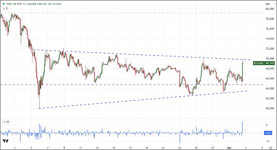 Following its best two hour rally since April 9 2025, Bitcoin is stalling at the top of this well defined wedge near $70,000.