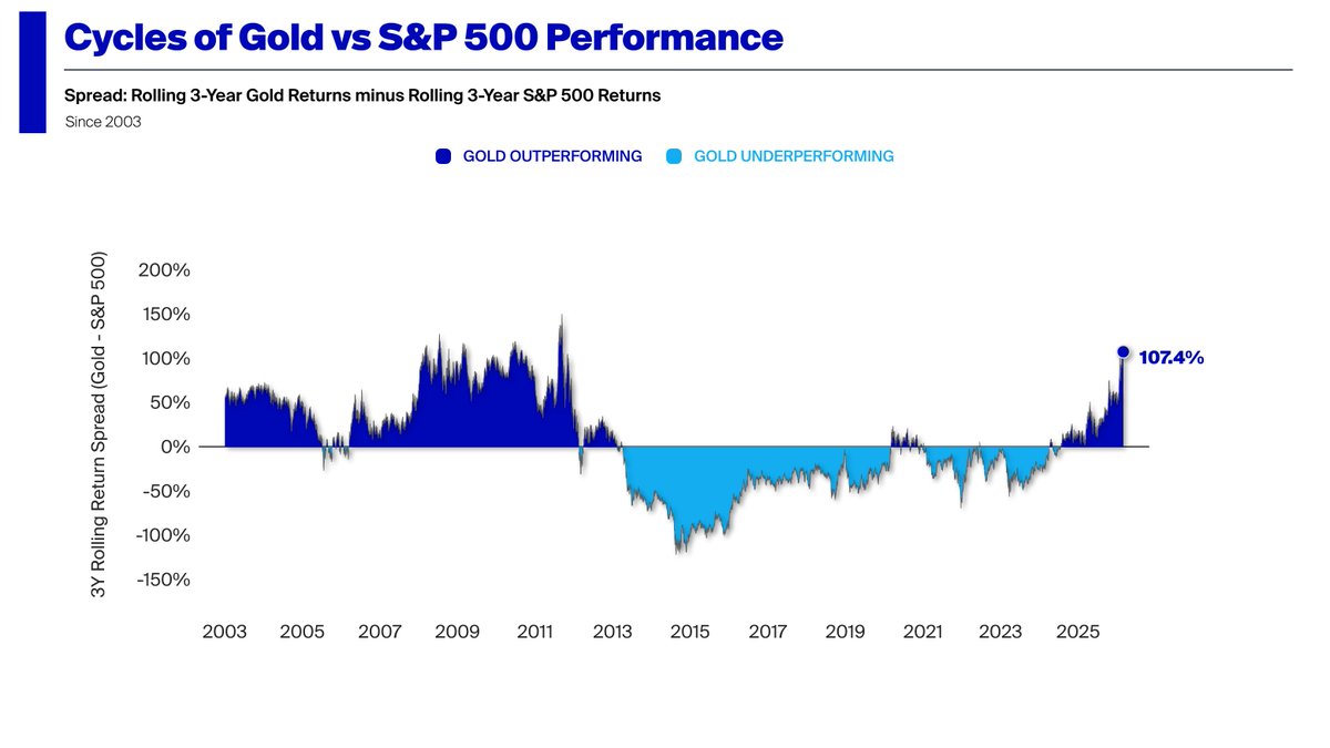 On a rolling three year basis, Gold is outperforming the S&P 500 by the widest margin since the period following the 2008 financial crisis.