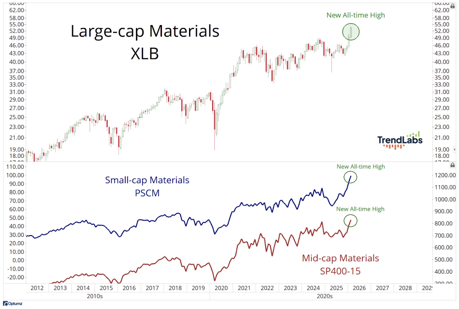 Materials strength has been broad-based this year, with large, mid, and small-cap materials all posting double-digit gains year-to-date.