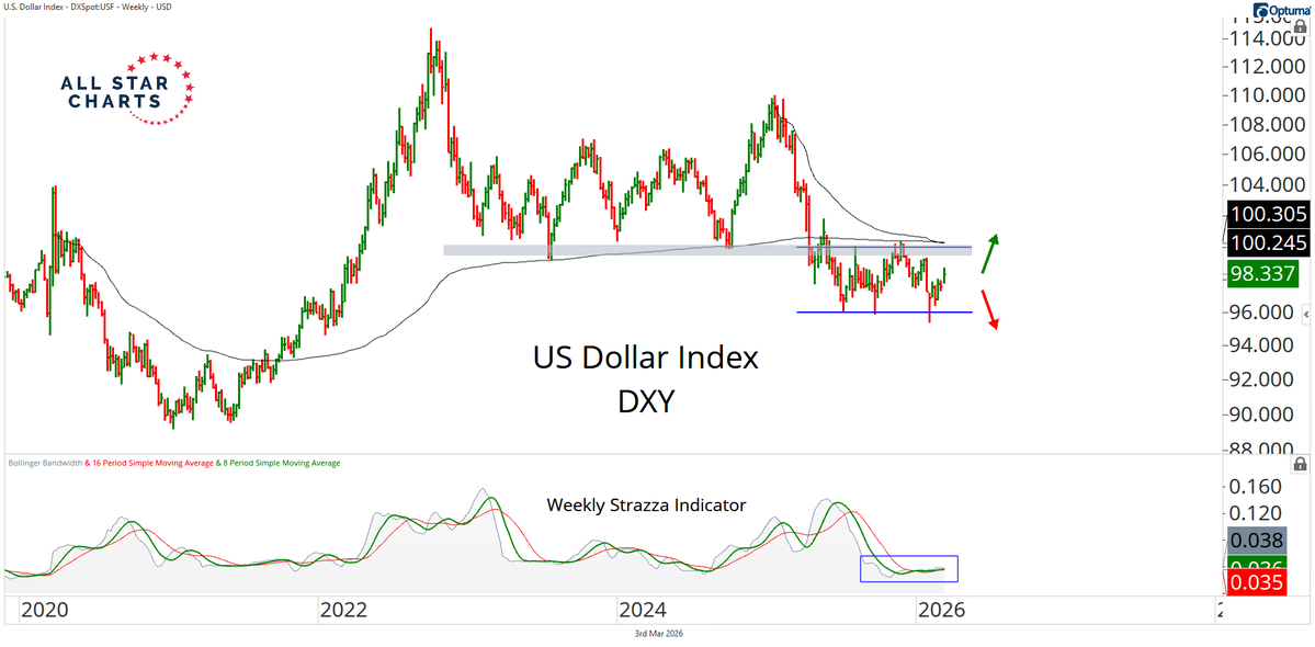 The Takeaway: The dollar is consolidating just below major polarity, and its next move is likely to set the tone for risk assets.