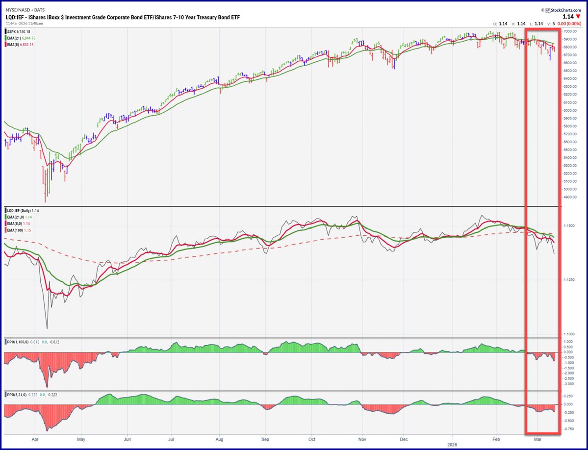 Investment Grade Corporate Bonds relative to 7β10 Year Treasuries (LQD/IEF) made new multi-month lows today and suffered its third-worst session since last Halloween.