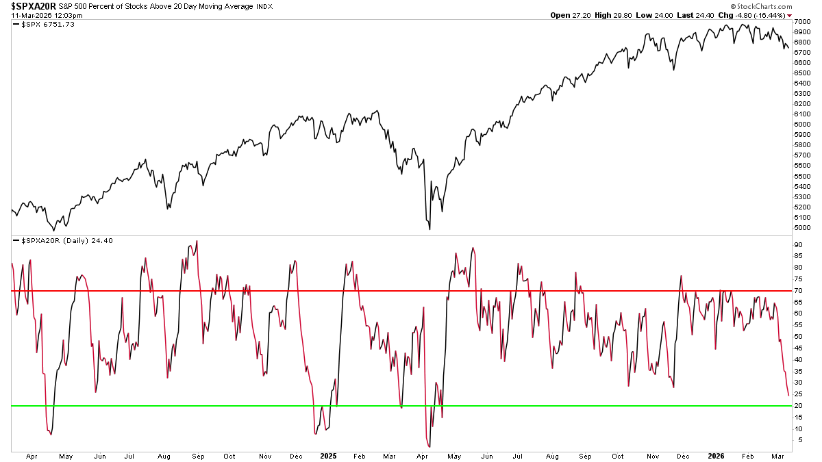 The percentage of S&P 500 stocks trading above their 20-day moving averages has dropped to its lowest level since last April.