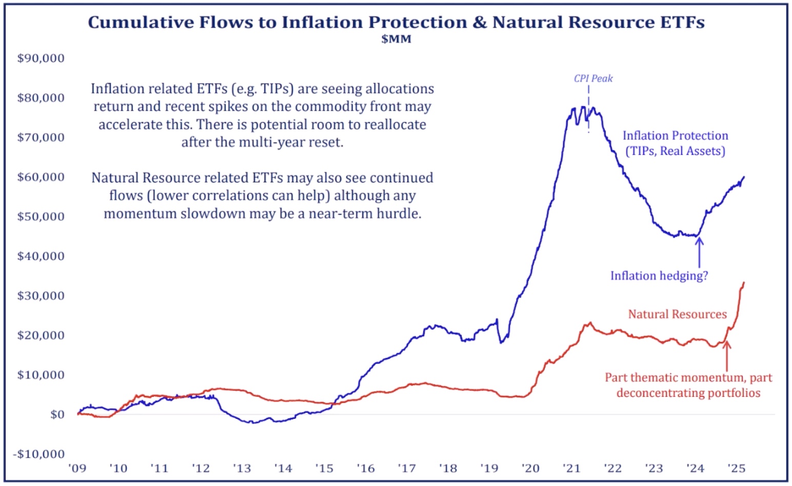 Weβre seeing an uptick in cumulative flows into inflation protection and natural resource ETFs.