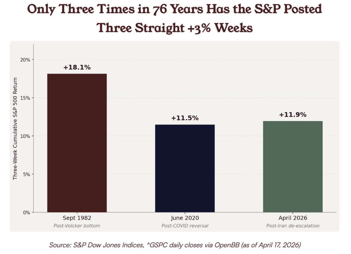 The S&P 500 has been up 3% for 3 weeks in a row for just the third time since 1950.