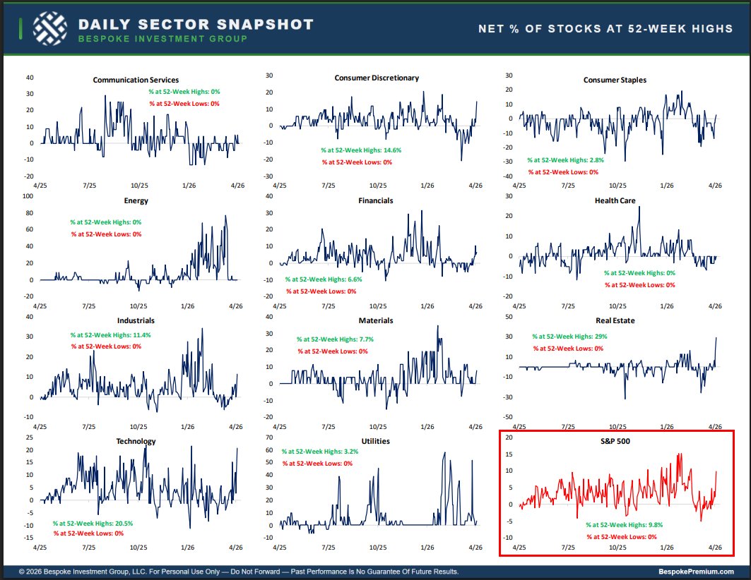 Technology, Real Estate, and Consumer Discretionary are seeing the largest % of stocks at 52-week highs.