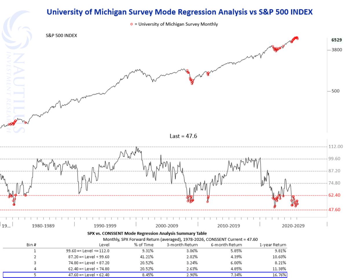 When the Michigan Consumer Sentiment survey reaches these depressed levels, average one-year returns have been roughly +16.76%.