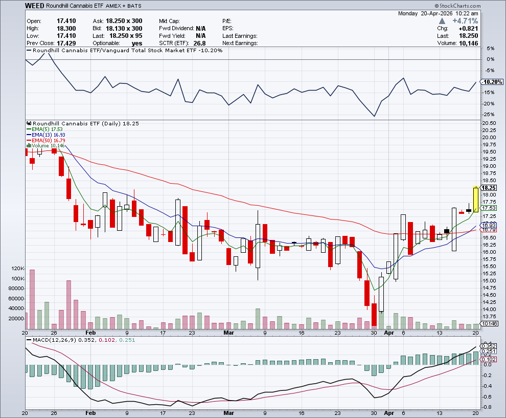 The Roundhill Cannabis ETF (WEED) broke out to new 2-month highs on 4/20.
