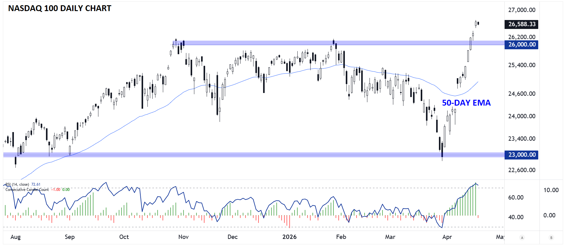 The Nasdaqβs 13-day winning streak has come to an end, and if the pullback continues, the prior resistance level at 26k may act as potential support.