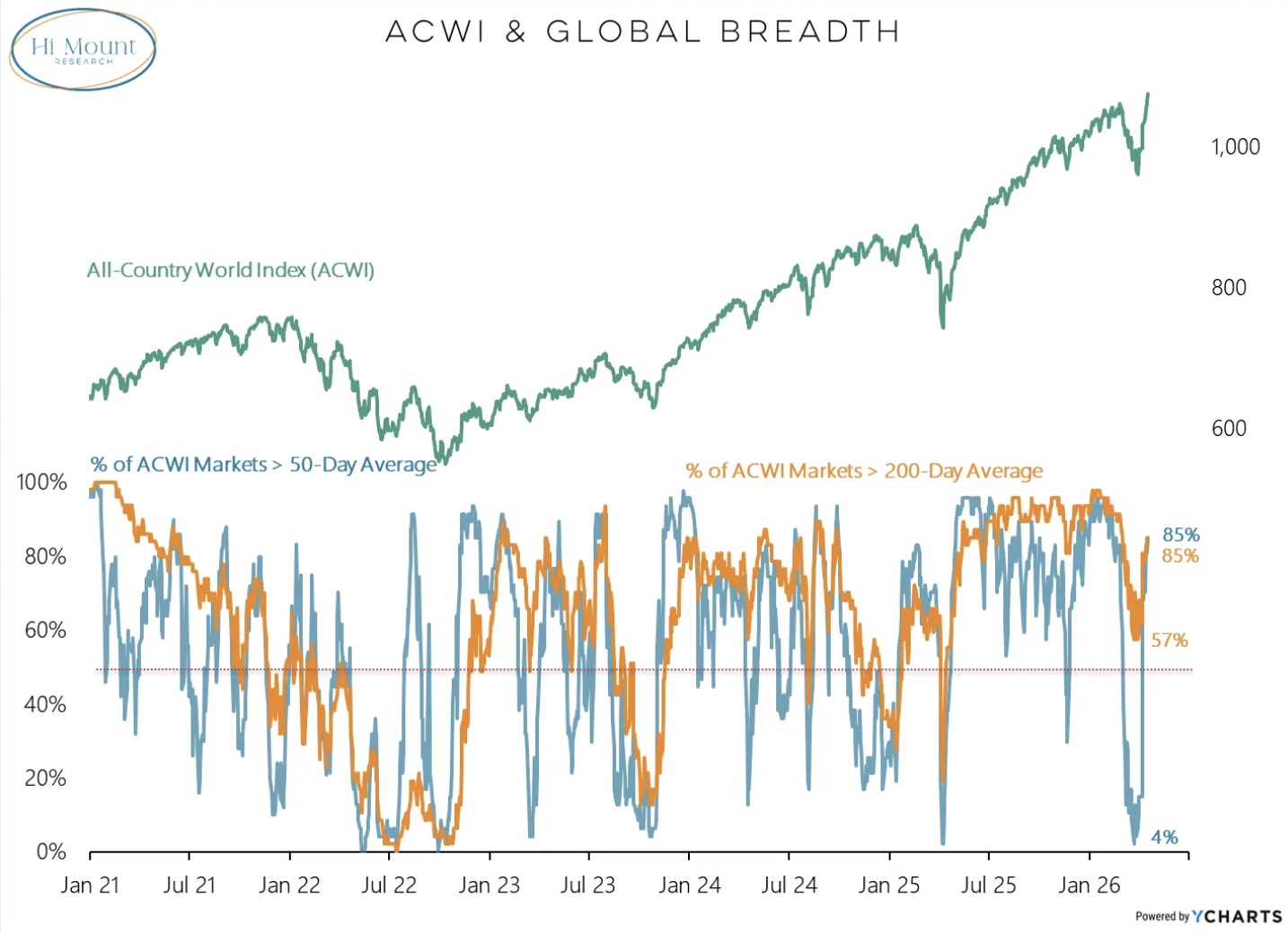 The percentage of global markets above their 50 and 200-day moving averages is back above 80%.