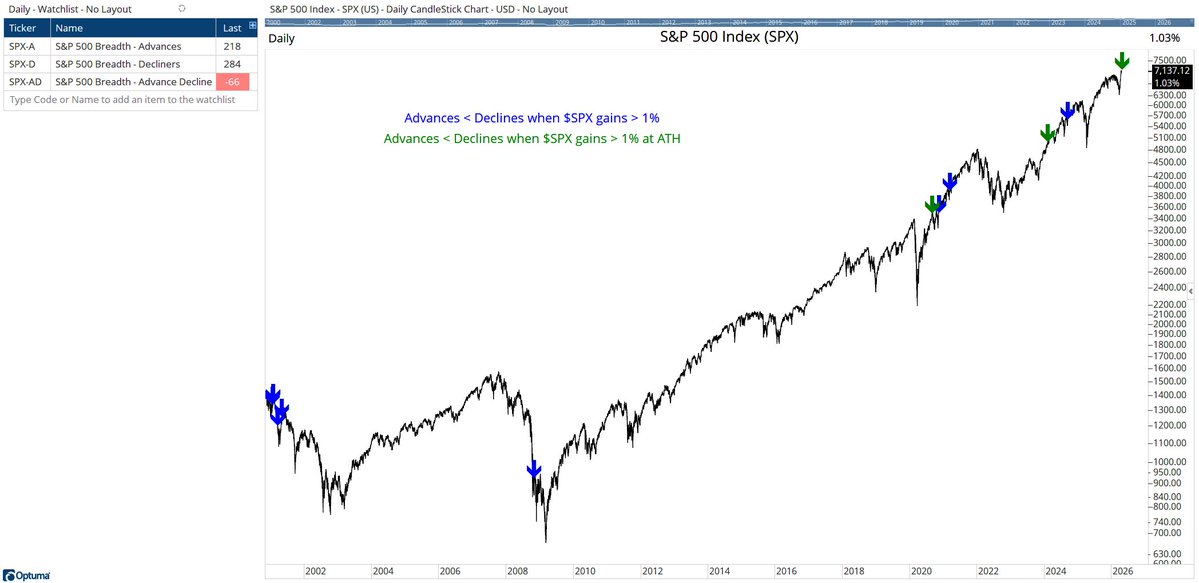 Yesterday marked only the 10th instance since 2000 where the S&P 500 gained 1% despite more decliners than advancers, and just the 3rd time it occurred alongside a new all-time high.