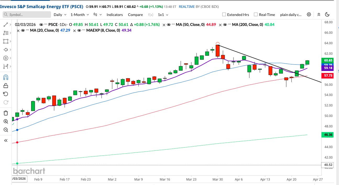 The Small-cap Energy ETF (PSCE) has reclaimed all major moving averages after breaking above its short-term downtrend line.