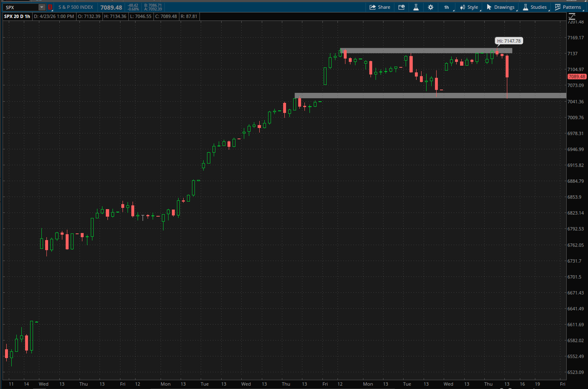 The S&P 500 is consolidating in a roughly 100-point range, with resistance near 7,150 and support around 7,050.