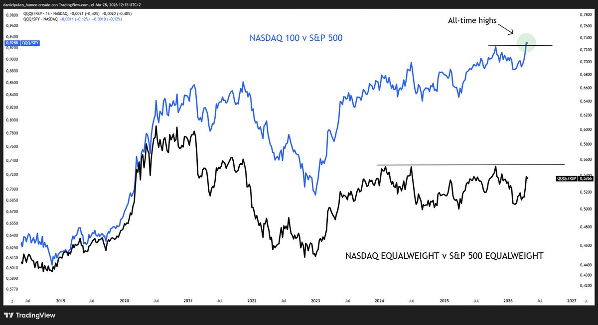 The Nasdaq 100 relative to the S&P 500 made new highs, while their equal-weight counterparts are still stuck in a range.