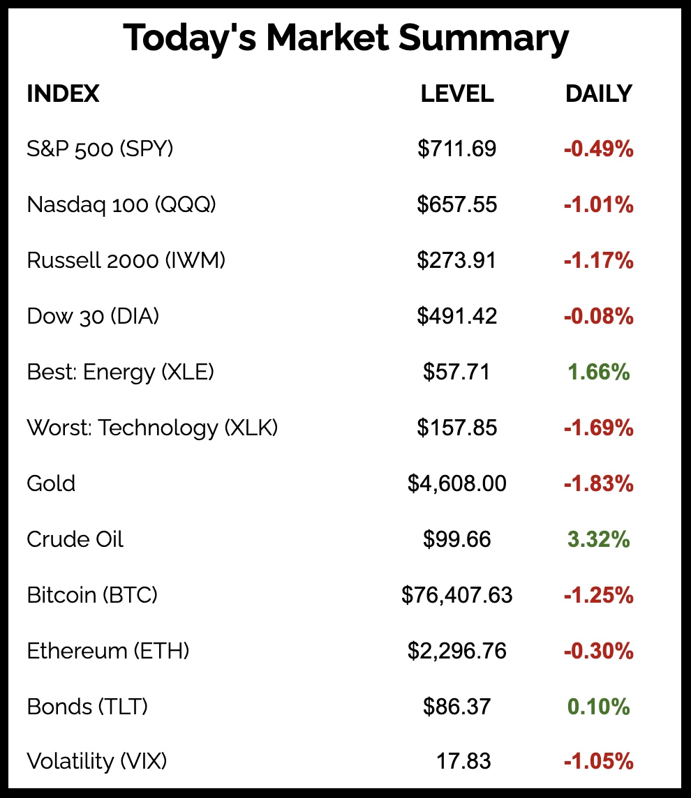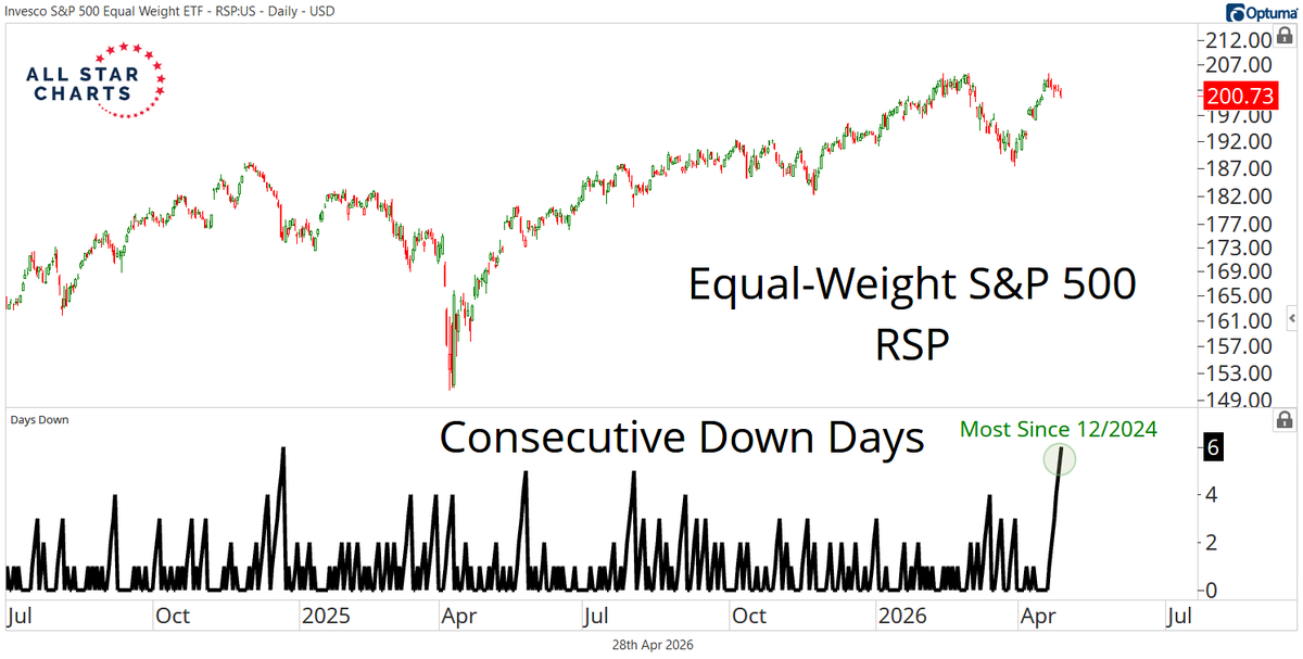The equal-weight S&P 500 has closed lower for 6 consecutive sessions, its longest losing streak since December 2024.