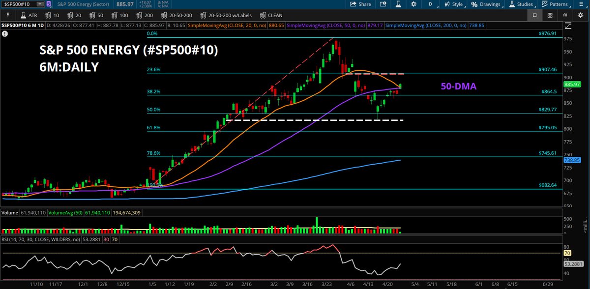 The Energy Select Sector (XLE) has reclaimed both its 20 and 50-day moving averages while successfully holding the 50% retracement of this yearβs advance.