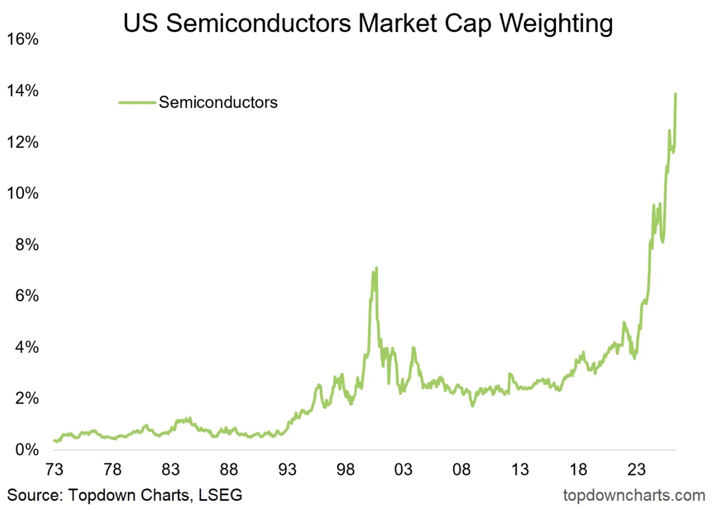 Semiconductor weighting within the S&P 500 has climbed to 14%, roughly double its peak during the dot-com era.