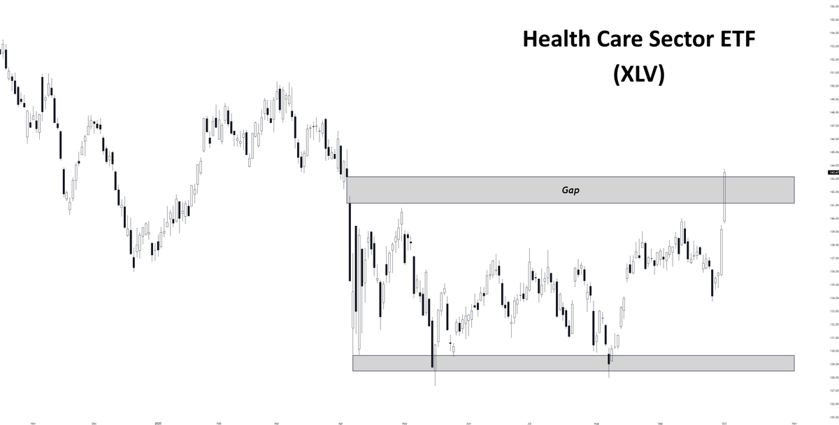 - Wingman notes that $XLV busted out of a six-month range today, filling its Liberation Day gap. While the recent pop leaves $XLV extended by most short-term measures, a long-term trend reversal is likely underway, and rotation into this beaten-down sector could continue in Q4.