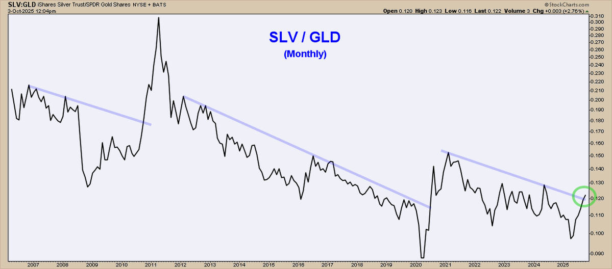 - Jim notes that the Silver/Gold ratio is finally breaking a four-year downtrend, signaling continued leadership from Silver in the months ahead. This also confirms a growing risk appetite for precious metals.