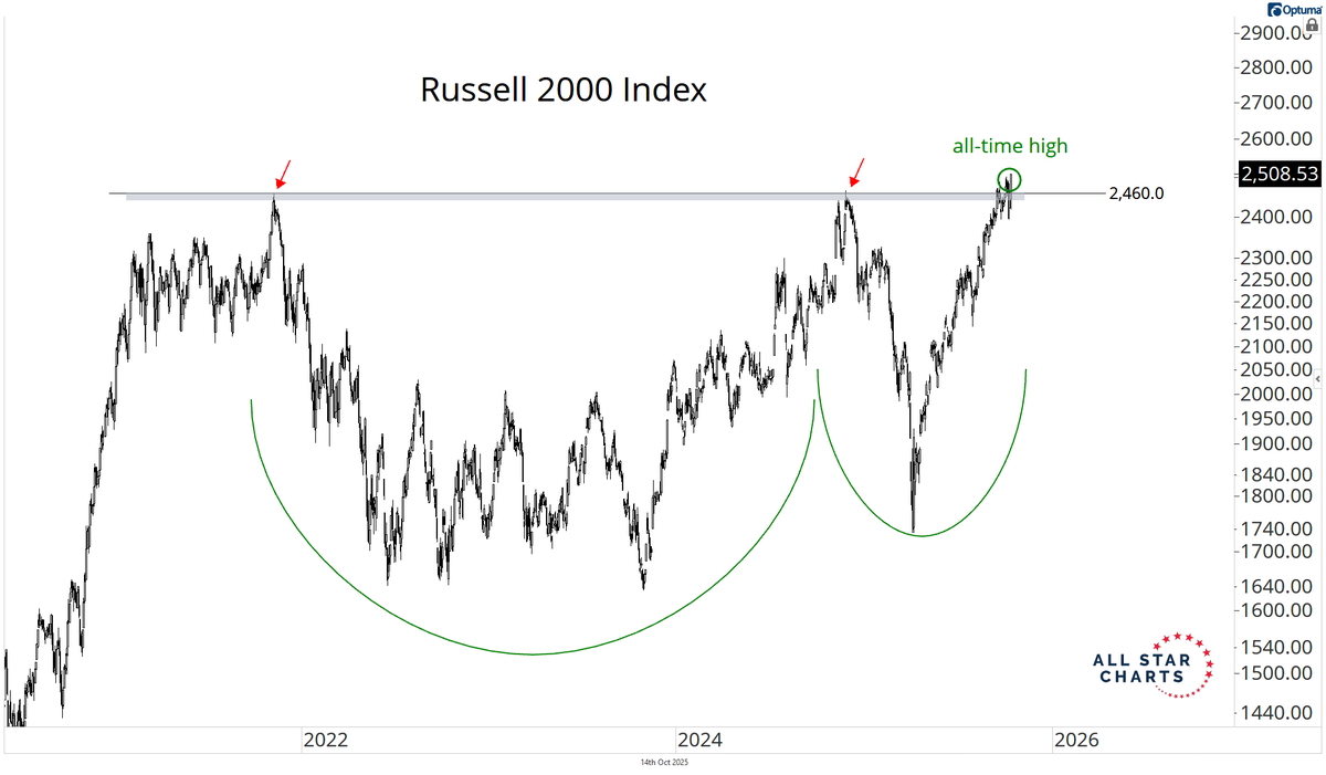 The Takeaway: The Russell 2000 ($IWM) broke out to an all-time high ahead of its large-cap peers today. It's resurfacing from a multi-year accumulation pattern after a brief shakeout.