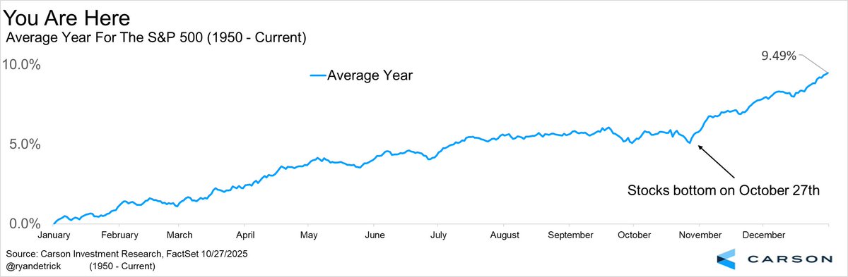 - The S&P 500 kicked off the week with another gap-and-go to fresh all-time highs. Ryan points out that, on average, since 1950, $SPX has historically bottomed today (October 27th) before rallying into year-end.