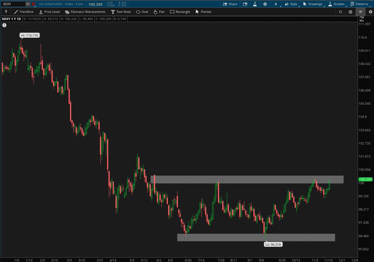 - As Rachel points out, $DXY is testing a pivotal area around $100 for the fourth time. It has quietly carved out a six-month base, and a decisive breakout would further confirm a durable bottom.