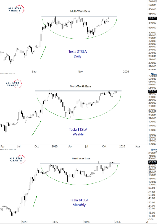 The Takeaway: With bases forming across all major timeframes, a breakout in Tesla would signal renewed leadership from one of the marketβs most influential stocks, and an overall bullish development for the Consumer Discretionary sector.