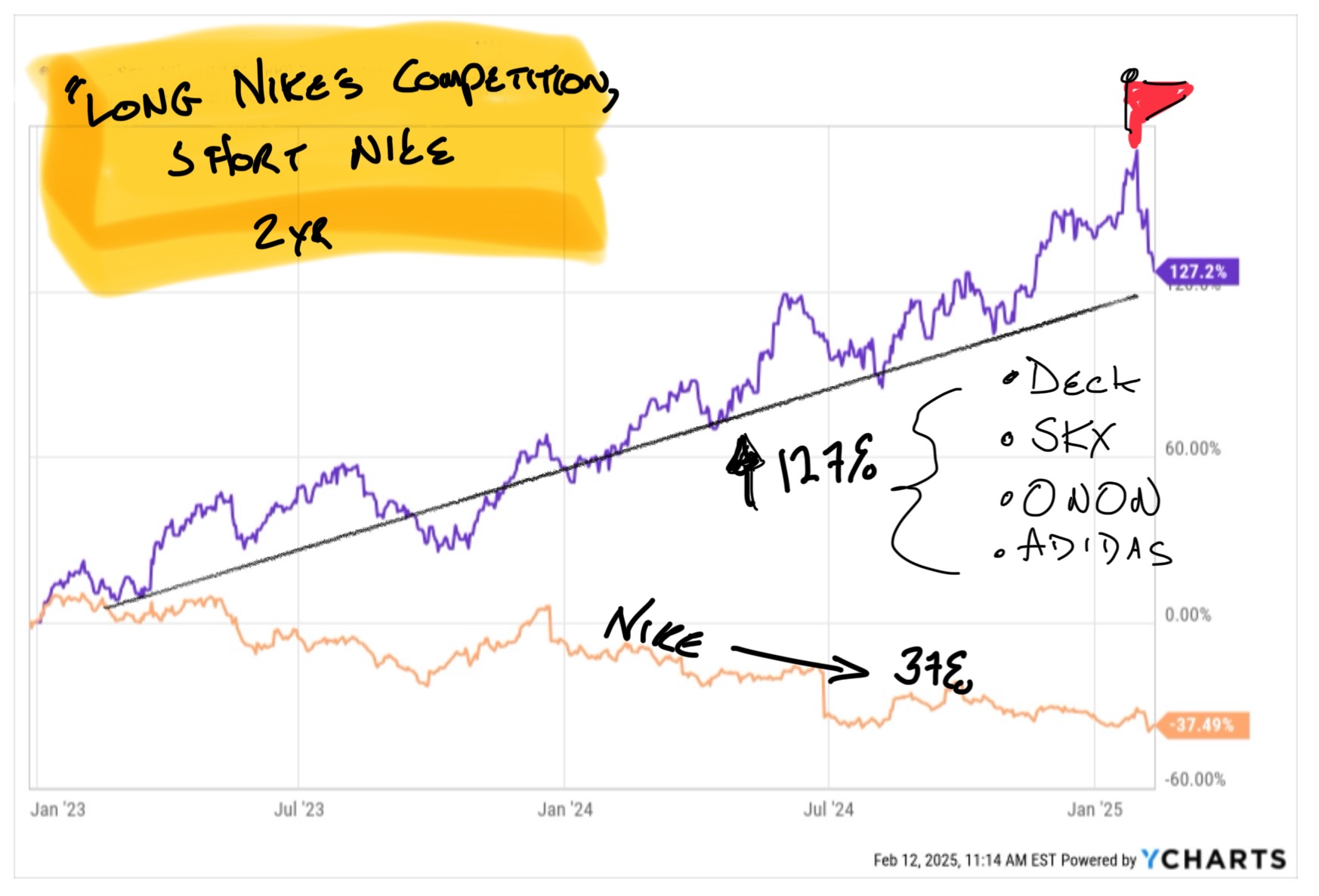 Here's a basket of On, Deckers, Adidas and Skechers long vs Nike since the start of 2023: