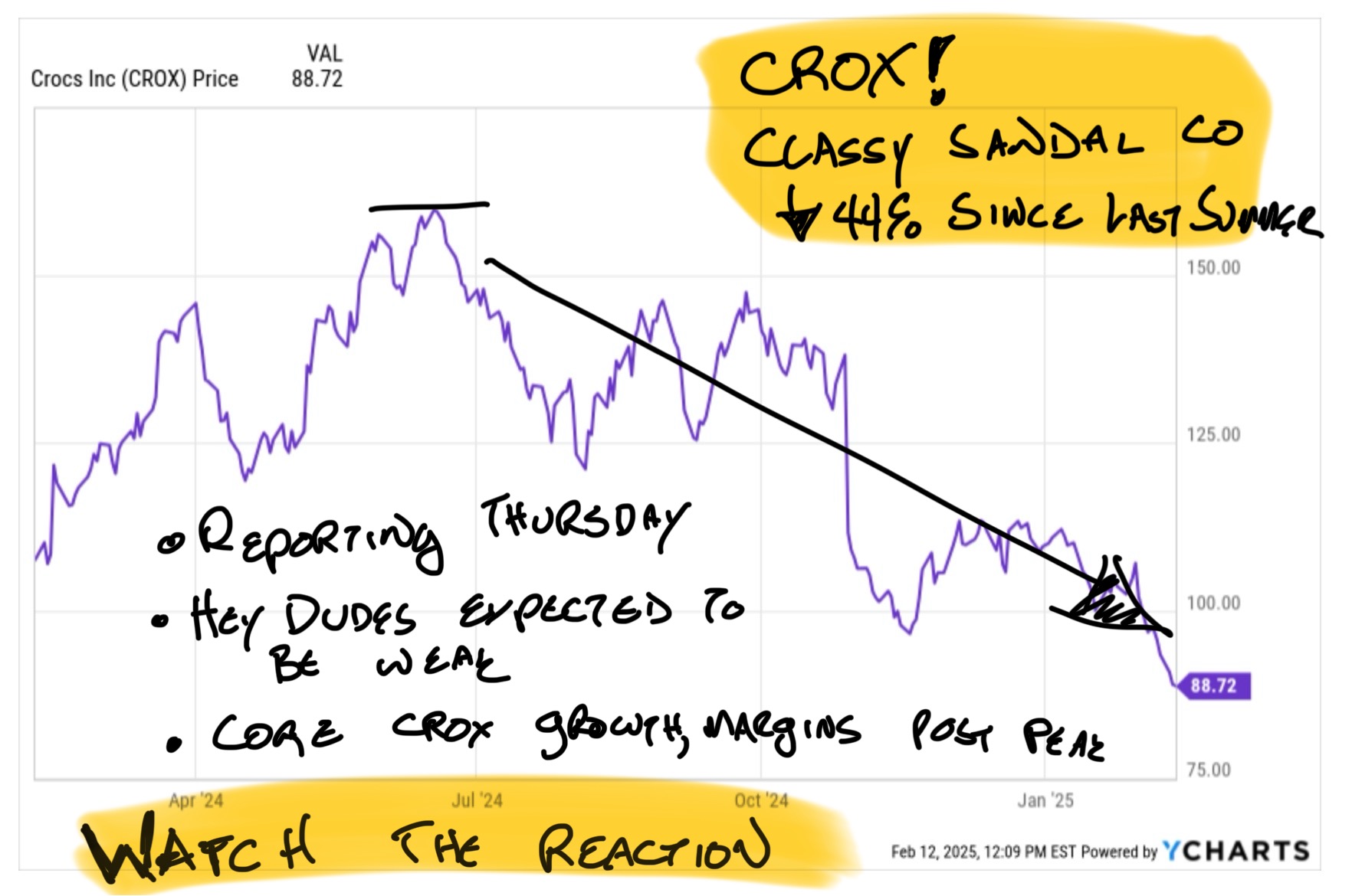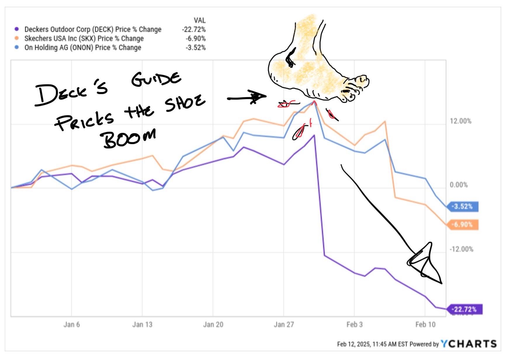 That's how it's been playing out and the trade worked great. But that was before tariffs and questions about saturation and some currency headwinds. And it was really before Deckers pulled a "Beat and Disappoint" quarterly report in late January.
