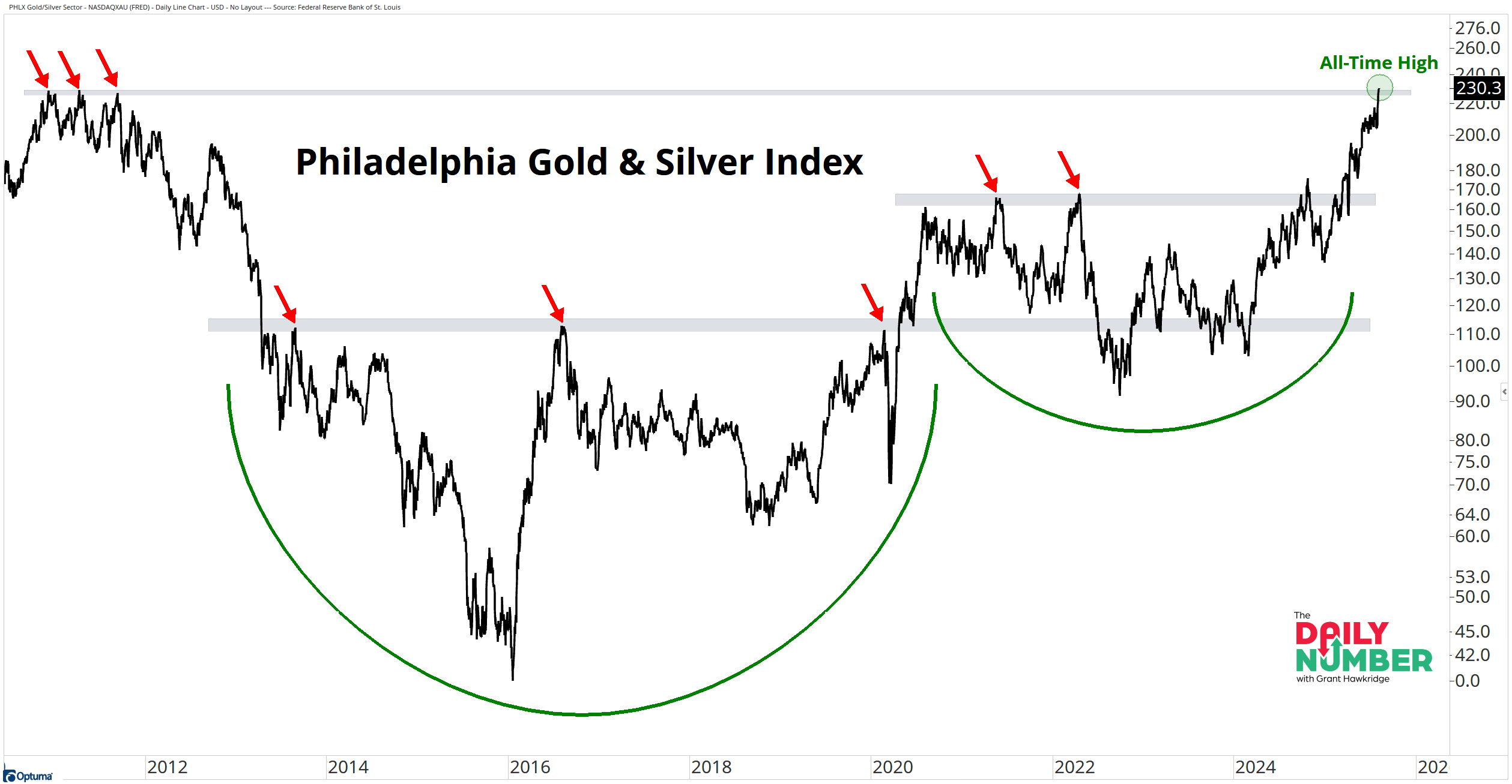 The Philadelphia Gold & Silver Index closed at the end of last week at 230.3, which is a fresh all-time high — its first in over 14 years.