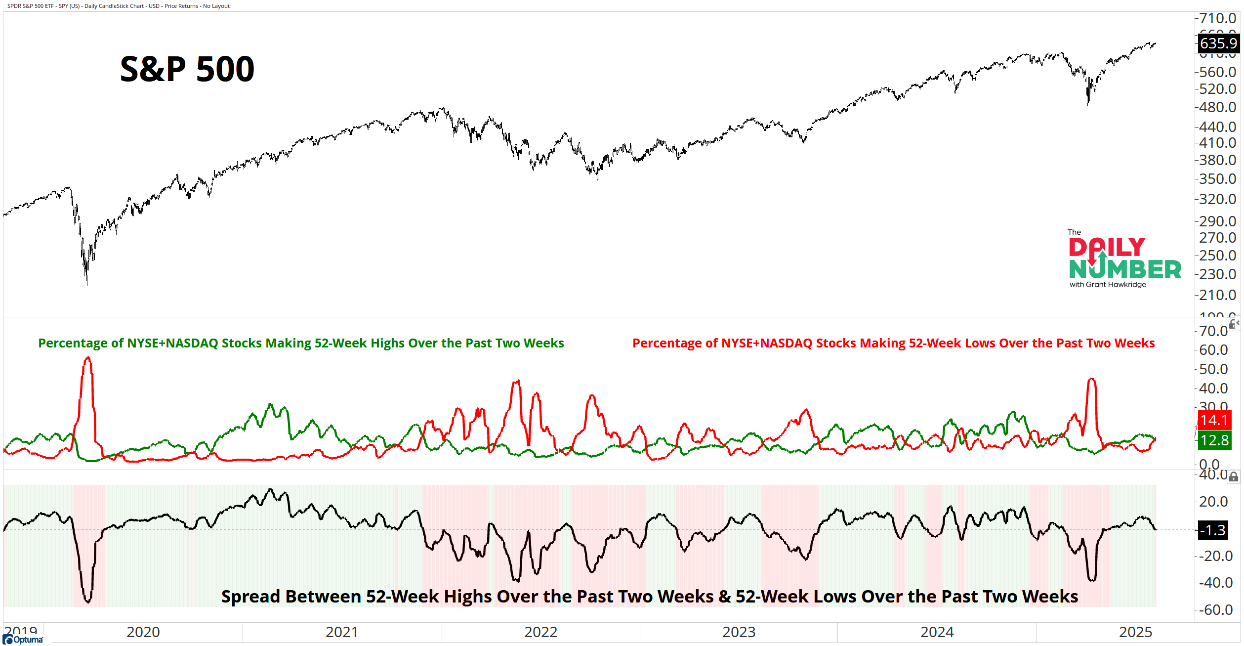 The bottom panel is the two-week spread (highs minus lows) shown as a black line. Background shading turns green when the two-week net 52-week highs exceed lows, and red when lows exceed highs.