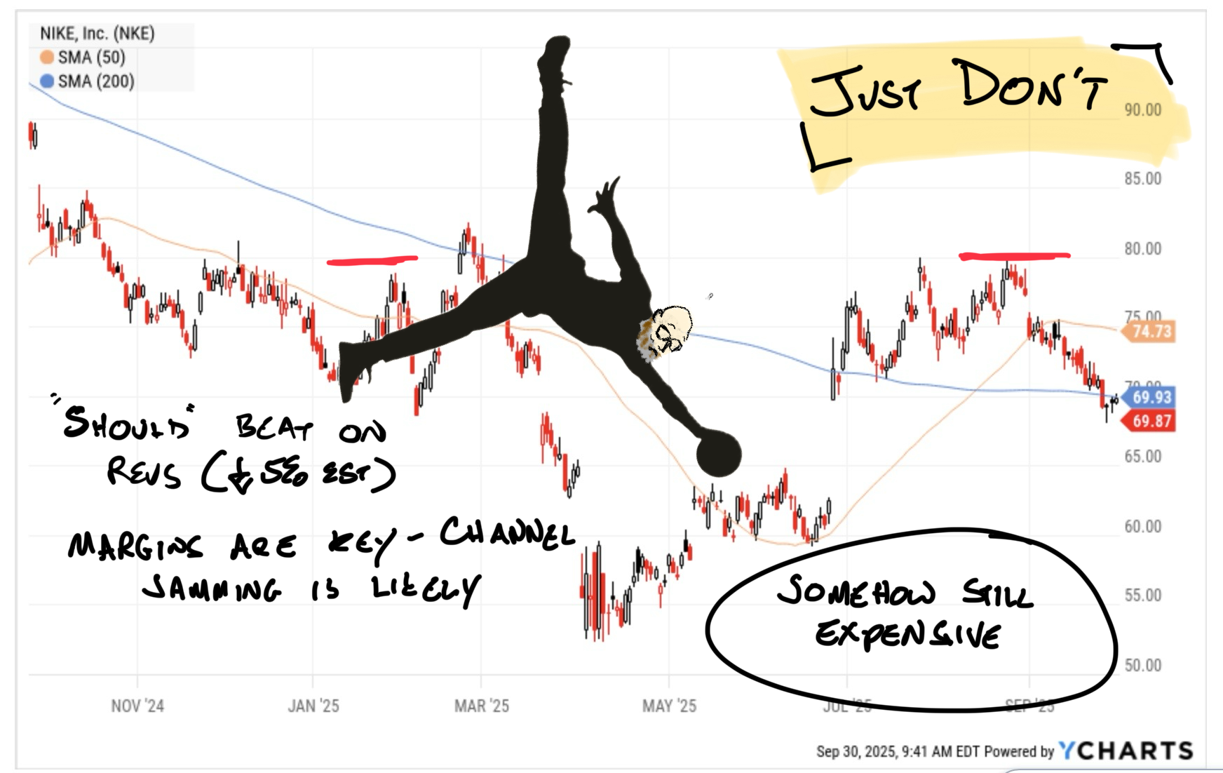 Nike isn’t the short it once was. Elliott is motivated, having been passed over for Donahoe’s failed tenure. If shares had bounced to $80, I’d get short. 4-5% seems fair enough. It means the weak guidance is more about sandbagging than genuine concern. Nothing too exciting. I’m noting the strength in the US and apparel, as well as the weakness in China, and turning to other opportunities.
