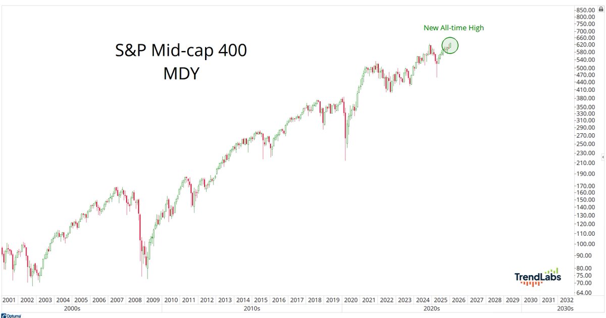 • The S&P Mid-Cap 400 ($MDY) pushed to new all-time highs for the first time since 2024, after a prolonged period of underperformance versus both Large and Small-Caps.