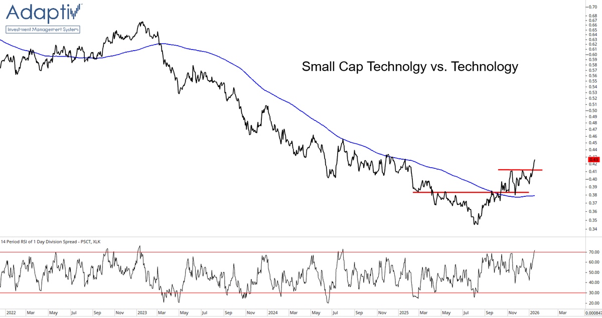 The Takeaway: While recent narratives have focused on “rotation” out of Technology, the chart suggests this is more of a market-cap shift, with capital increasingly favoring smaller names within the sector.