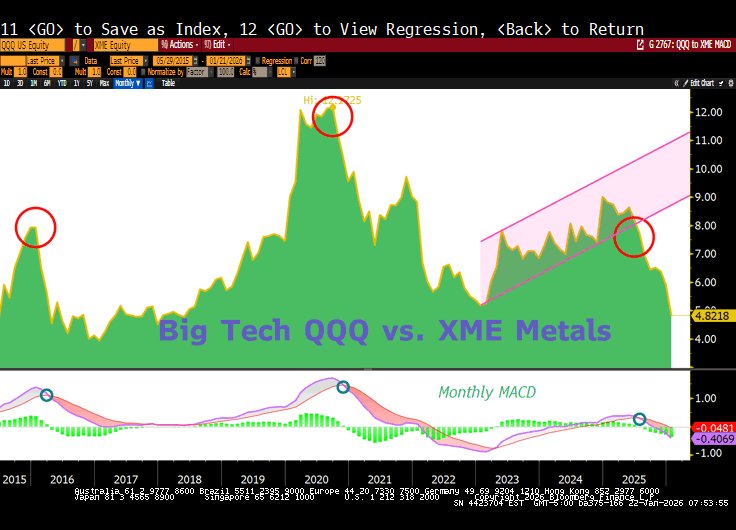- As Lawrence highlights, $XME has significantly outperformed $QQQ over the past five years, with the Nasdaq now on pace for its second-worst month versus $XME in history.
