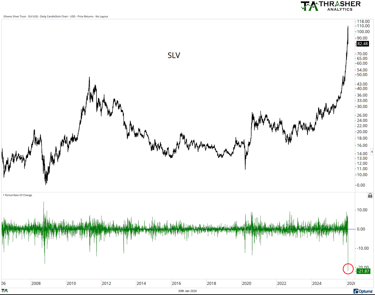 - Following a historic rally, the Silver ETF ($SLV) posted its worst day ever today, plunging nearly -30%.