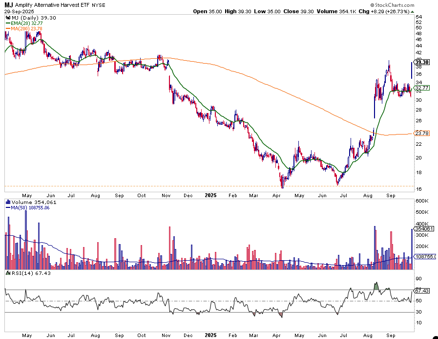 - As Eric points out, today's surge occurred on the heaviest volume in more than a year. The primary trend remains lower, but $MJ is firmly above a rising 20-day moving average, and the 200-day moving average has curled higher since August.